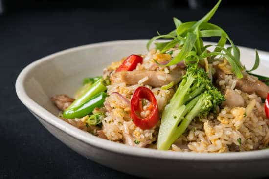 אורז שום מוקפץ עם נתחי פרגית ג'ינג'ר, ברוקולי, צ'ילי חריף, פטריות שיטקה ושמפניון, בצל ירוק וסגול וביצה.
